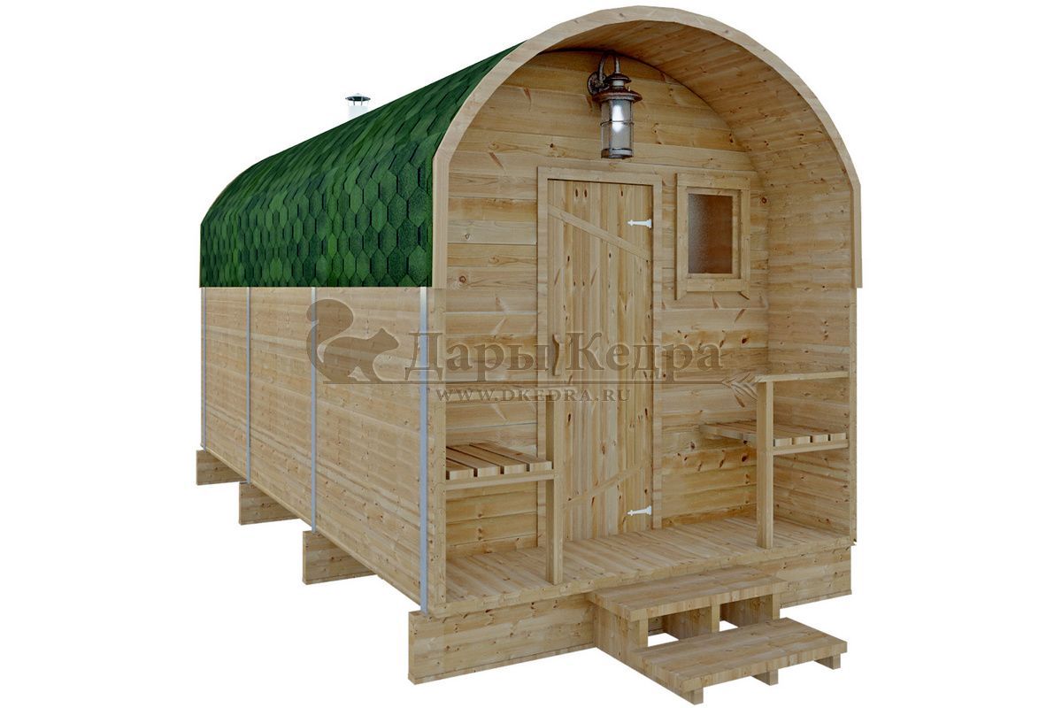 • Баня-бочка буханка из кедра с верандой (все размеры) Баня-буханка более просторная за счет увеличенной высоты потолков и ровного пола. На веранде можно оставить вещи или отдохнуть после процедур парения. Лавочки из кедра находятся по всей длине бани-бочки с обеих сторон. Печь расположена в парилке около дальней стены. Время растопки такой бани не превышает 30 минут. В зависимости от выбранного размера баня-бочка буханка с верандой имеет следующую комплектацию: Баня-бочка буханка 2,5 метра - парилка; Баня-бочка буханка 3,5 и 4,5 метра - раздевалка, парилка; Баня-бочка буханка 5,5 метров - раздевалка, парилка, моечная. По вашему желанию ее можно укомплектовать печью с внешней загрузкой, благодаря которой весь мусор вовремя топки остается на улице. Баня-бочка буханка не требует полноценный фундамент, поэтому при необходимости ее можно перенести в другое место. Обращаем Ваше внимание, что в стандартную комплектацию бани входят полки открытого типа в парной с обеих сторон. Дополнительно можно заказать полок закрытого типа или лавку! Кедр обладает ароматическими свойствами. Он не деформируется и влагоустойчив, при правильном уходе за деревом на нем не развиваются грибки и плесень.