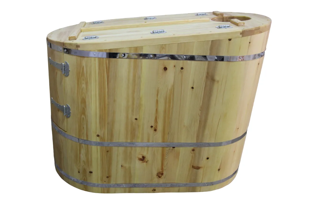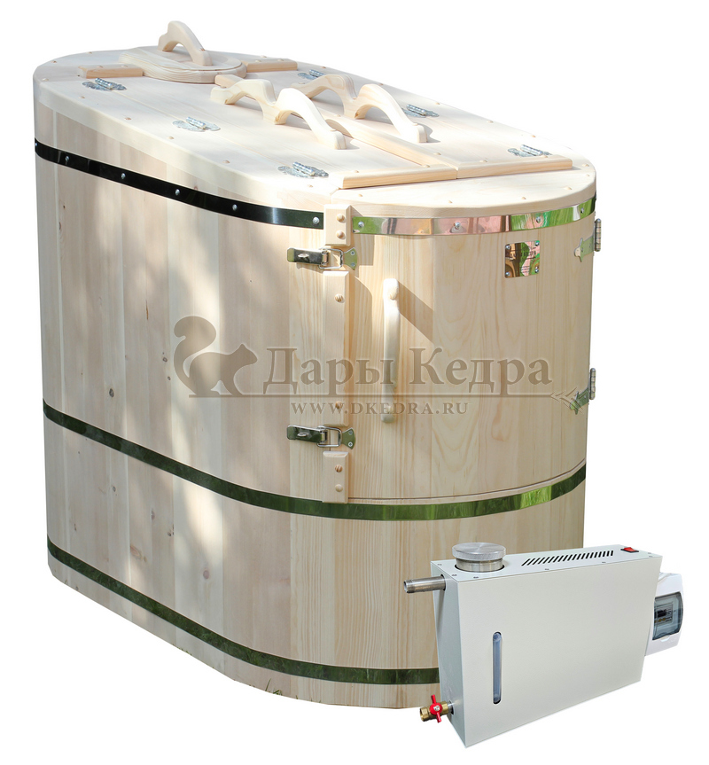 Готовый комплект - это полностью укомплектованный набор с полулежачей фитобочкой для процедур парения. Такая модель наиболее комфортна, так как позволяет принимать процедуры полулежа. Толщина стенок составляет 40-45 мм, что позволяет увеличить срок службы изделия. Фитобочка оборудована откидными створками, дверцей и отверстием для головы. Во время парения человек находится внутри кедровой бочки, а голова снаружи. Благодаря этому исключается возможность перегрева