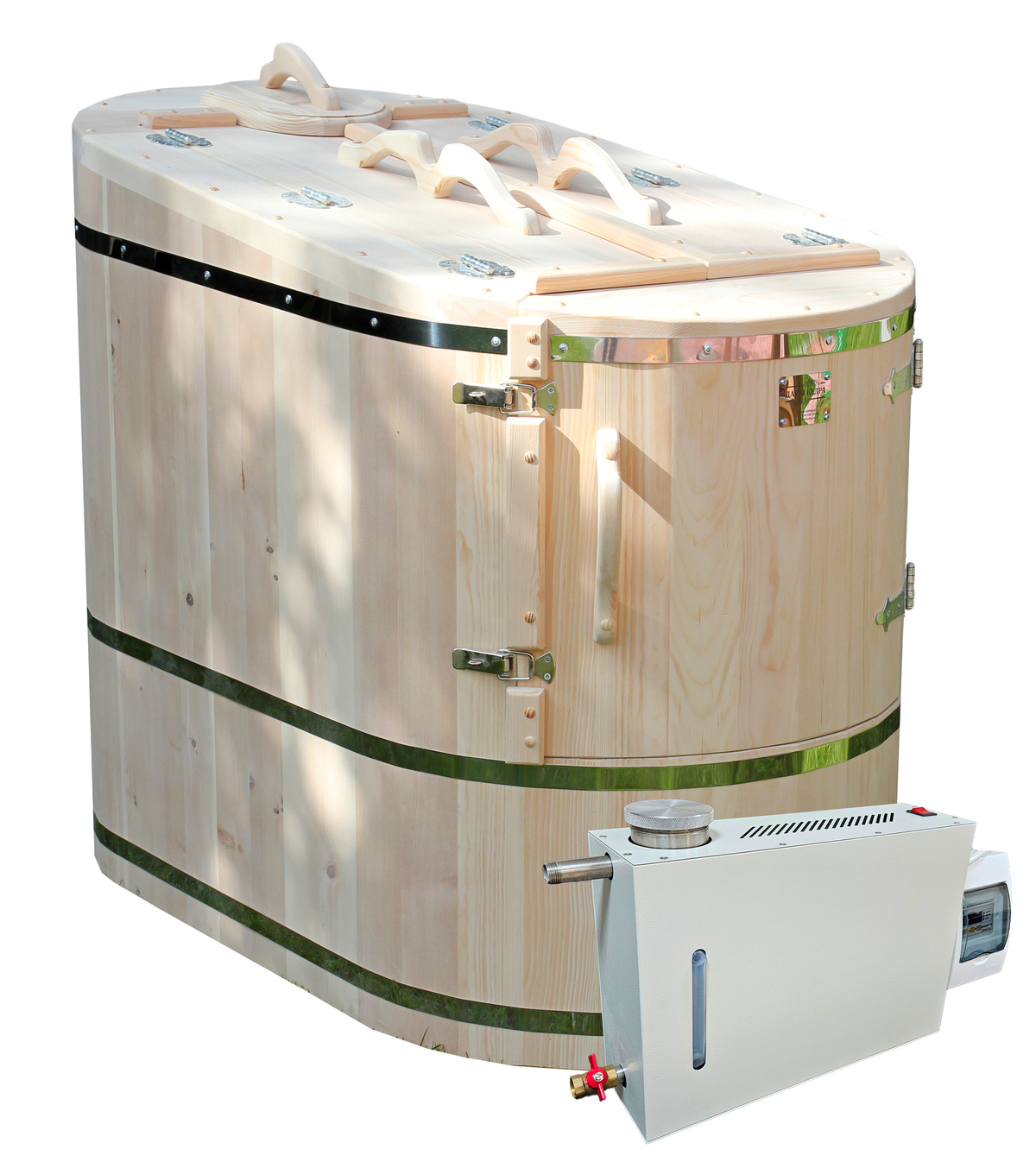 Готовый комплект «Универсальный»: кедровая бочка с парогенератором + био-защита изнутри и снаружи Готовый комплект - это полностью укомплектованный набор с фитобочкой для процедур парения. Овальная модель более просторна и удобна в использовании. Толщина стенок составляет 40-45 мм, что позволяет увеличить срок службы изделия. Верхний скос делает положение головы более комфортным и улучшает обзор. Фитобочка оборудована откидными створками, дверцей и отверстием для головы. Во время парения человек сидит внутри кедровой бочки, а голова находится снаружи. Благодаря этому исключается возможность перегрева. Подлокотники из кедра, встроенные ручки на створках и двери делают эксплуатацию более удобной. Парение в фитобочке благотворно влияет на организм в целом: повышается иммунитет, выводятся шлаки и токсины, улучшается работа органов тела и состояние кожи.