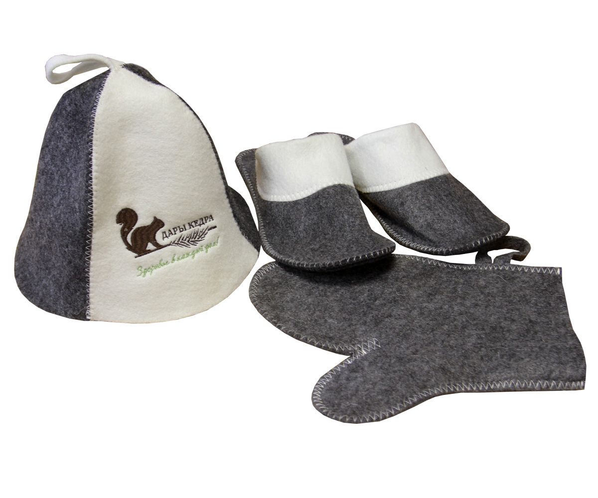 Фирменный набор для бани и сауны: шапка, тапочки, рукавица из войлока Комплект: шапка, тапочки, рукавица с фирменным логотипом будут отличным дополнением к бане, защищая от высоких температур и подчёркивая вашу индивидуальность во всём!